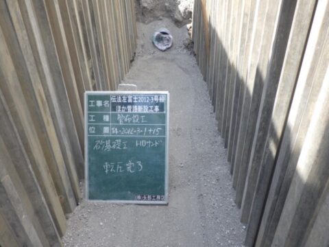 バックホウを使用して所定の深さまで掘削を行いました。掘削と同時に、安全対策としてアルミ矢板1段梁による土留支保工を設置し、作業員の安全を確保しながら施工を進めました。土留支保工は掘削面の崩壊を防ぎ、周辺地盤への影響を最小限に抑える重要な役割を果たします。