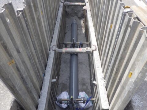 本工事では、公共下水道の管路を新設するため、掘削から管布設、マンホール設置、埋戻し、舗装仮復旧までの一連の作業を実施しました。特に安全性を重視し、土留支保工としてアルミ矢板1段梁を使用することで、掘削時の土砂崩壊を防止しながら作業を進めました。