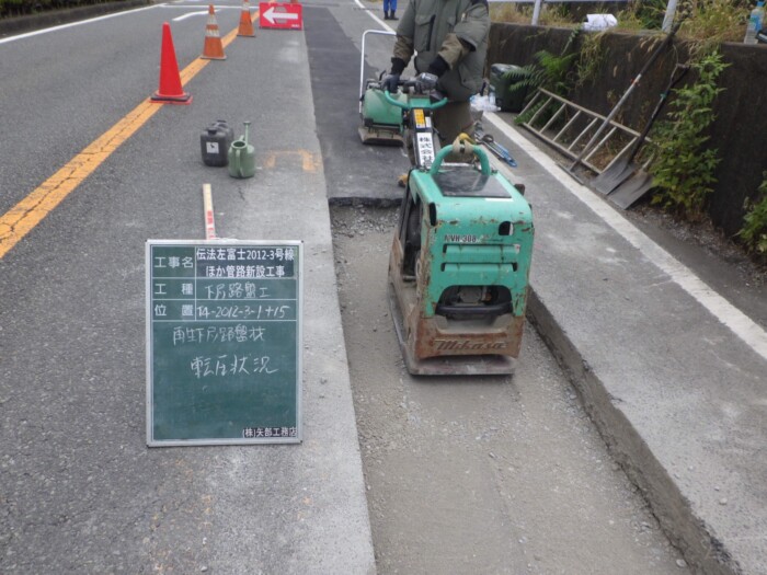 管布設とマンホール設置完了後、埋戻し作業を実施しました。再生下層路盤材を使用し、適切な締固めを行いながら層ごとに転圧を実施することで、将来的な地盤沈下を防止します。