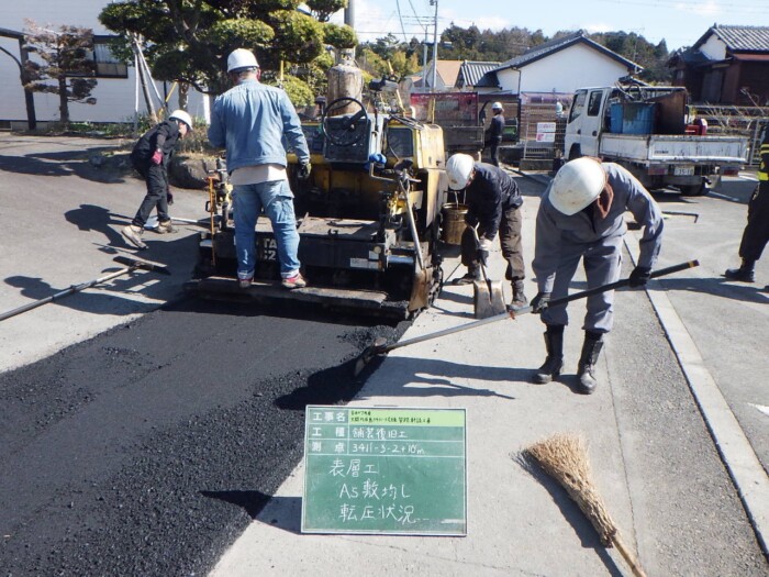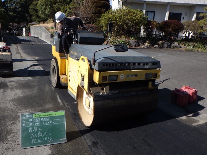 舗装本復旧の最終工程として、表層のアスファルト舗設を実施しました。アスファルト混合物を均一に敷き均し、ローラーによる転圧を行うことで、平坦性と密実性を確保しました。適切な転圧により、耐久性の高い舗装面を実現します。